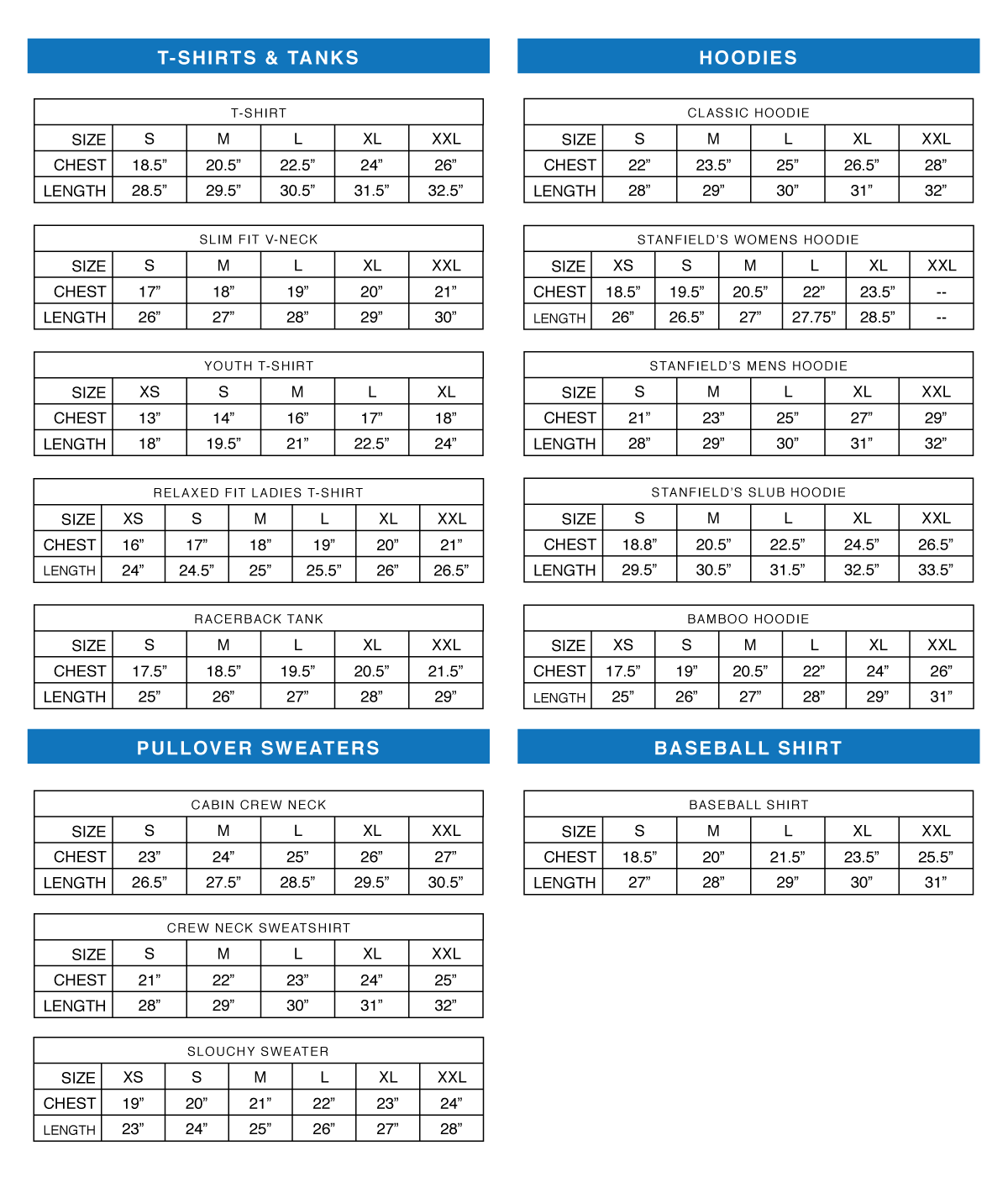 Please note - because many of our garments are hand-cut and sewn, our sizes may vary from these charts by up to one inch. The chest sizing measures from side-seam to side-seam, not around the garment.